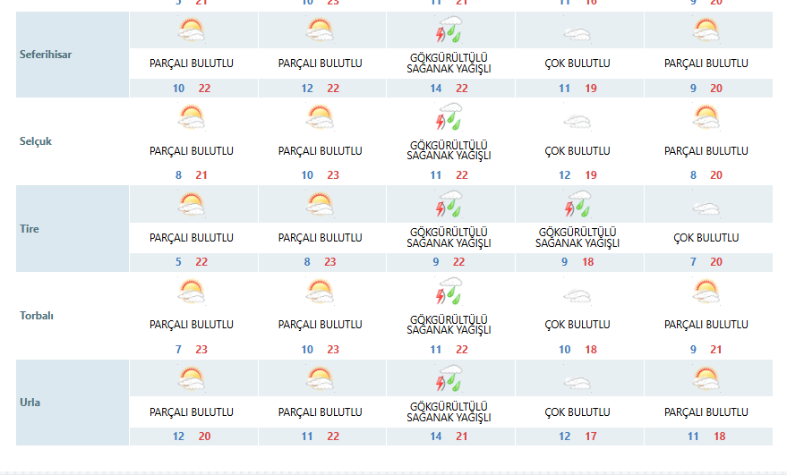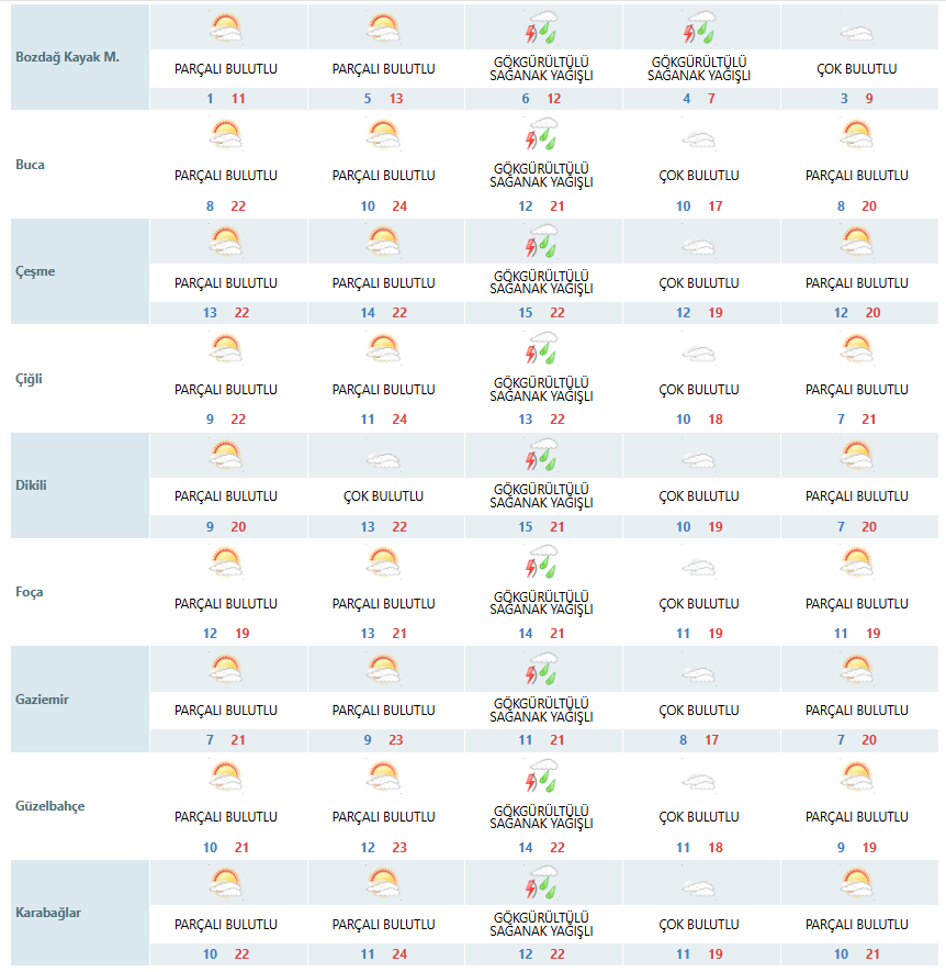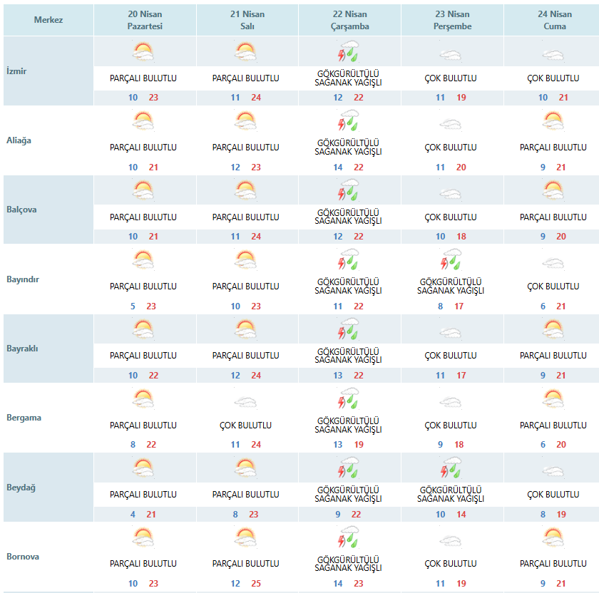 SONKALEİZMİR-Meteoroloji 2. Bölge Müdürlüğü verilerine göre İzmir'de yeni haftada çarşamba günü haricinde yağış beklenmiyor. Bugün ve yarını parçalı bulutlu geçirecek kentte çarşamba günü tüm ilçelerde sağanak yağış etkili olacak. Perşembe ve cuma günü ise bulutlu geçecek. Hava sıcaklıkları hafta boyunca en düşük 10, en yüksek 24 derece olacak.