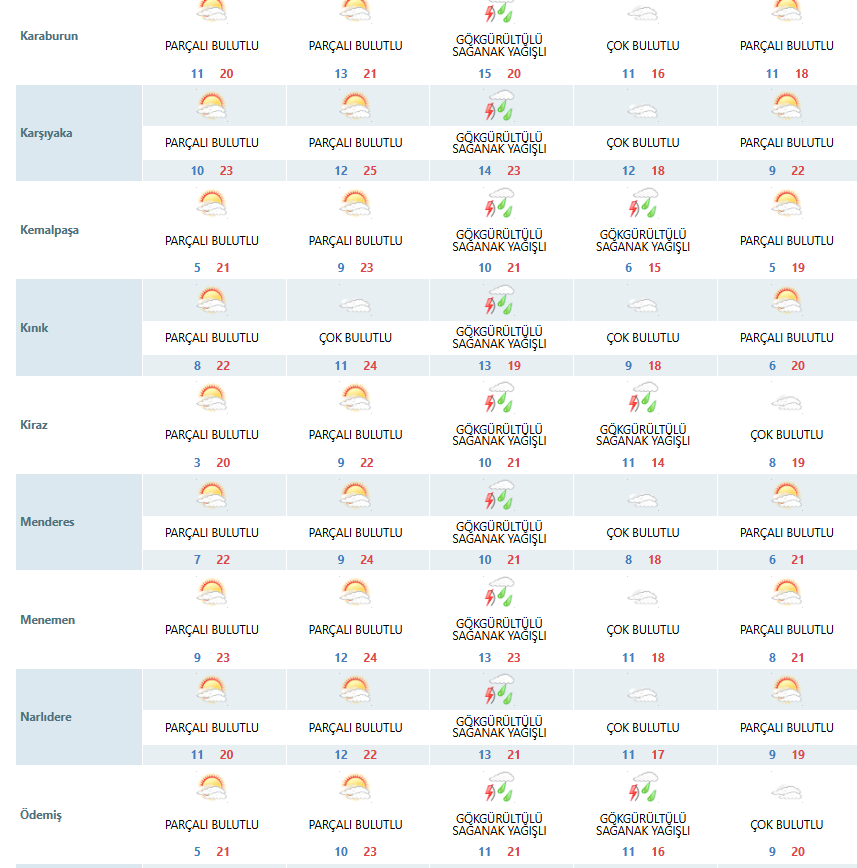 İlçe ilçe hava durumu verileri şöyle: