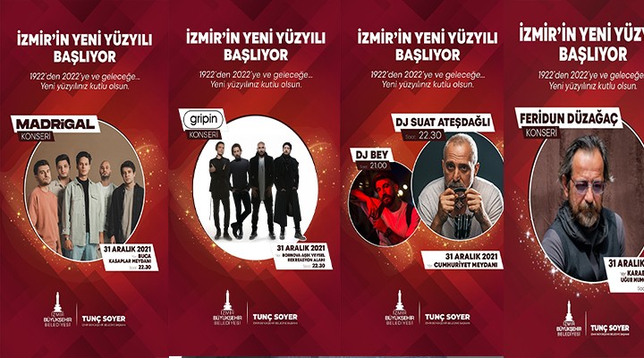 “İzmir’in yeni yüzyılı başlıyor” sloganıyla yeni yıl coşkusunu kentin her köşesine yaymayı amaçlayan İzmir Büyükşehir Belediyesi, 31 Aralık Cuma gecesi usta müzisyenleri ağırlayacak. Cumhuriyet Meydanı’nda 21.00’de “DJ Bey”in performansının ardından 22.30’da 1983’ten bu yana DJ kabininde olan Suat Ateşdağlı sahne alacak. Alternatif rock grubu “Madrigal” ise Buca Kasaplar Meydanı’nda 22.30’da İzmirliler ile buluşacak. Bornova Âşık Veysel Rekreasyon Alanı’nda yine 22.30’da “Gripin”, Karabağlar Uğur Mumcu Parkı’nda ise Feridun Düzağaç konseri var. Yılbaşı eğlencesi video mapping gösterileriyle renklenecek.