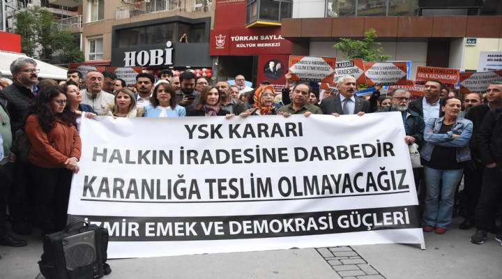 Alsancak Kıbrıs Şehitleri’ndeki Türkan Saylan Kültür Merkezi önünde toplanan, Emek ve Demokrasi Güçleri üyesi yaklaşık 70 kişi, YSK’nın İstanbul Büyükşehir Belediye Başkanlığı için yapılan seçimlerin yenilenmesi yönündeki kararını protesto etti. 'Karanlığa teslim olmayacağız', 'Hak, hukuk, adalet' ve 'Her şey çok güzel olacak' sloganları atan grup adına basın açıklamasını, İzmir Tabip Odası Genel Sekreteri Dr. Lütfi Çamlı okudu. Yüksek Seçim Kurulu üyelerinin bu karar ile kanunun kendilerine verdiği yetkiyi kötüye kullandığını söyleyen Çamlı, "Evrensel hukuku ve halkın iradesini ayaklar altına alan bu karar, demokrasi tarihine kara bir leke olarak geçmiştir. Bu karar ülkemizde yargı bağımsızlığının ortadan kalktığını ve yargının siyasi iktidar tarafından bir araç olarak kullanıldığını, talimatla çalışan bir yapı haline geldiğini bir kez daha göstermiştir. Ülkemizde giderek derinleşen ekonomik krize bizzat ülkeyi yönetenler tarafından yönetimde meşruiyet krizi eklenmiştir" dedi.