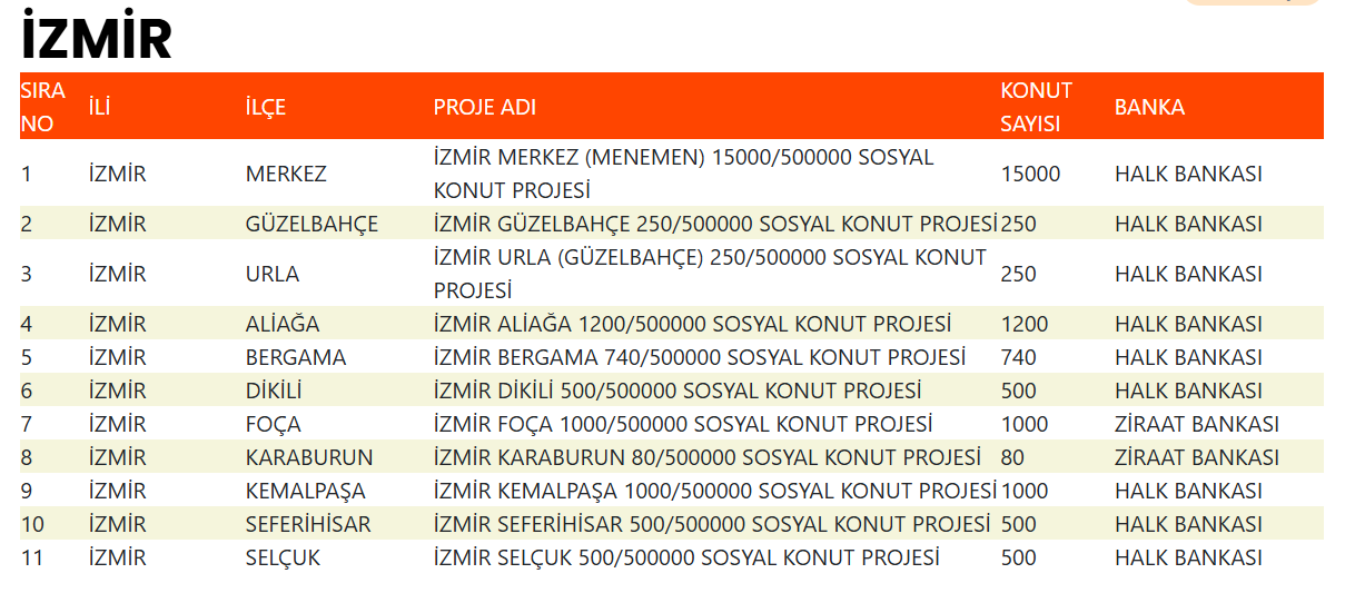 Bu kapsamda İzmir'de de 21 bin 520 konut inşa edilecek. Konutlar Menemen, Güzelbahçe, Urla, Aliağa, Bergama, Dikili, Foça, Karaburun, Kemalpaşa, Seferihisar, Selçuk ilçelerinde yapılacak. AK Partili Aydın Pehlivan yönetimindeki Menemen 15 konut ile zirvede yer alırken, Aliağa'da 1200 konut yapılacak.