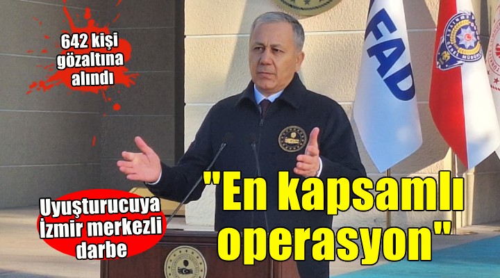 Elde edilen bilgiler sonrası dün sabah şafak sökmeden eş zamanlı operasyon başlattıklarını söyleyen Bakan Yerlikaya, "Uyuşturucuyla savaşımız, çok katmanlı ve çok boyutlu olarak kararlılıkla devam ediyor. Uyuşturucu suç örgütü elebaşından, yöneticisinden torbacısına kadar tedarik zincirinin her halkasını tek tek kırıp atacak ayrı ayrı operasyonlar düzenliyoruz. Sadece uyuşturucu maddeleri yakalamakla kalmıyor, bu organize suç faaliyetlerinin tedarik ağlarını çökertiyor ve suç gelirlerine darbe vuruyoruz. Torbacılar, uyuşturucu suç örgütlerinin sahadaki eli, kolu, gözü, kulağıdır. Bunlar aracılığıyla sokaklara iniyorlar. İşte Narkokapan operasyonlarıyla biz, bu zehir tacirlerinin bir bakıma elini kolunu kesiyoruz. Hareket kabiliyetlerini yok ediyoruz. Yani uyuşturucu ağının sinir uçlarını hedef alıyor ve pazarlama ağlarını parçalayıp atıyoruz. Hava ve deniz unsurlarımızca da desteklenen Narkokapan İzmir operasyonuna 4 bin 500 polis, 956 ekip ve 8 özel eğitimli narkotik dedektör köpeği katıldı. İzmir merkezli olmak üzere 14 ilde, 608 ayrı adrese eş zamanlı operasyon gerçekleştirdik ve 641 şahıs gözaltına alındı. Narkokapan operasyonlarıyla yakaladığımız torbacıların tutuklanma oranı yüzde 95" ifadelerini kullandı.