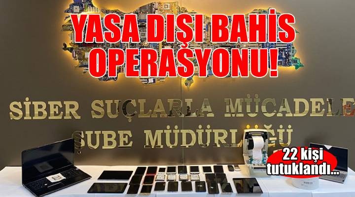 İl Emniyet Müdürlüğü Siber Suçlarla Mücadele Şubesi ekiplerince, yasa dışı bahis sitelerini kiralayıp yazılım desteği sağlayan ve bu siteler üzerinden yasa dışı bahis oynatan zanlıların İzmir, Kahramanmaraş, Mersin, Antalya, Muğla, Aydın, Manisa ve Balıkesir'de tespit edilen adreslerine eş zamanlı baskın düzenlendi.