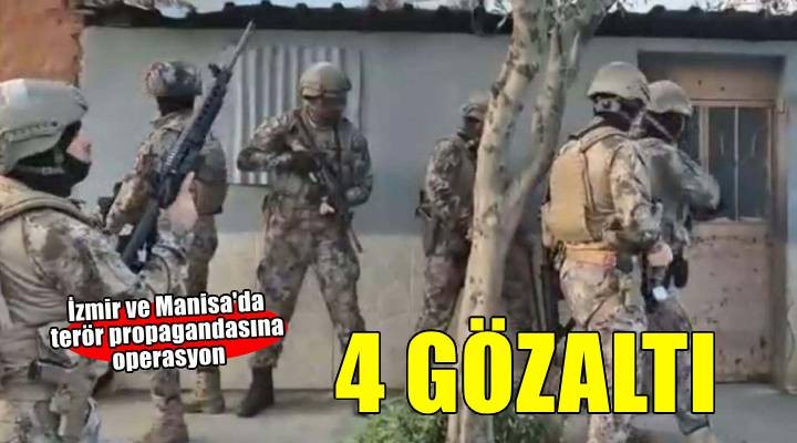İzmir Cumhuriyet Başsavcılığı koordinesinde, İl Jandarma Komutanlığı Terörle Mücadele Şube Müdürlüğü ekipleri tarafından sosyal medyada terör propagandası yapan şüphelilere yönelik çalışma yürütüldü. Sosyal medyada DHKP/C, THKP/C, TKP/ML ve DEV-YOL silahlı terör örgütlerinin propagandasını yapan 4 şüpheliye yönelik İzmir ve Manisa'da dün sabah eş zamanlı operasyon yapıldı. Jandarma ekipleri tarafından belirlenen evlere gerçekleştirilen operasyonda 4 şüpheli gözaltına alındı.
