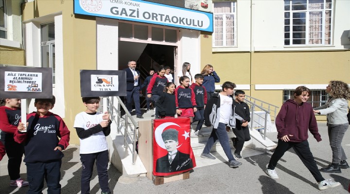 İzmir'in Konak ilçesindeki Gazi Ortaokulu'nda yapılan tatbikata, okuldaki 610 öğrenci ve 46 öğretmen katıldı.