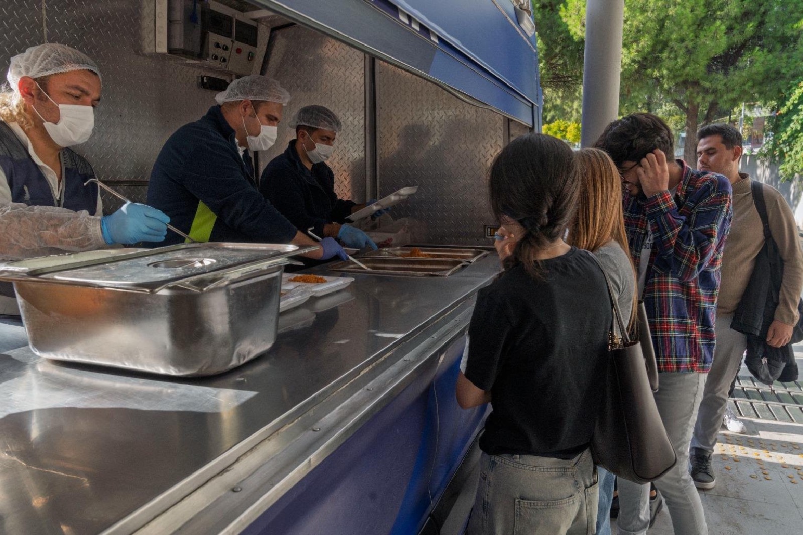 İzmir Büyükşehir Belediyesi artan enflasyon nedeniyle başta yeme-içme olmak üzere günlük ihtiyaçlarını karşılarken bile zorlanan üniversite öğrencilere desteğe devam ediyor. İzmir Büyükşehir Belediyesi hem kentte ikamet eden hem de başka şehirlerden gelerek ailelerinden uzakta yaşayan öğrenciler için Ege Üniversitesi içi metro durağı, Katip Çelebi Üniversitesi içi kız yurdu yakını, Bakırçay Üniversitesi içi, Demokrasi Üniversitesi önü, Dokuz Eylül Üniversitesi Tarık Akan Gençlik Merkezi önü ve İzmir Yüksek Teknoloji Enstitüsü (İYTE) içindeki kütüphane önünde oluşturulan noktalarda her gün 16.00-18.00 saatleri arasında ücretsiz olarak ortalama 4 bin kişilik yemek dağıtıyor.