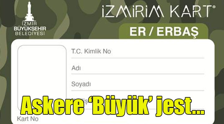 İzmir Büyükşehir Belediyesi ESHOT Genel Müdürlüğü, İzmir’deki askeri birliklerde görevli er ve erbaşlara toplu taşımadan ücretsiz yararlanma imkânı sundu. 7179 sayılı Askeralma Kanunu’nda yer alan “Hizmette geçen süre içinde kamunun ve belediyelerin işlettiği deniz ve şehir içi toplu taşıma hizmetlerinden ücretsiz yararlanır” hükmü gereğince er ve erbaşlara, toplu taşıma araçlarına ücretsiz binebilecekleri İzmirim Kart verilmesi kararlaştırıldı. Kartlar zorunlu askerlik süresi olan 6 ay boyunca geçerli olacak.