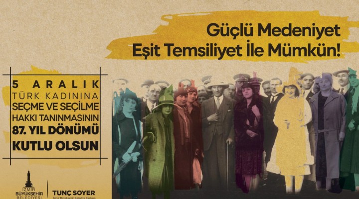 İzmir Büyükşehir Belediye Başkanı Tunç Soyer’in eşitlikçi politikaları ve “kadın dostu kent” vizyonu doğrultusunda 5 Aralık Pazar günü Türk kadınına seçme ve seçilme hakkı verilişinin 87’inci yılı İzmir'de bir dizi etkinlikle kutlanacak. Toplumsal cinsiyet rollerinden kaynaklanan kadın-erkek eşitsizliğiyle ilgili farkındalık oluşturmak amacıyla düzenlenen program kapsamında kadın milletvekilleri, belediye başkanları, meclis üyeleri, muhtarlar, siyasi partiler, kadın dernekleri, demokratik kitle örgütleri ve meslek odaları temsilcileri 12.30’da Kültürpark Lozan kapısında buluşarak Cumhuriyet Meydanı’na doğru yapılacak yürüyüşte bir araya gelecek.