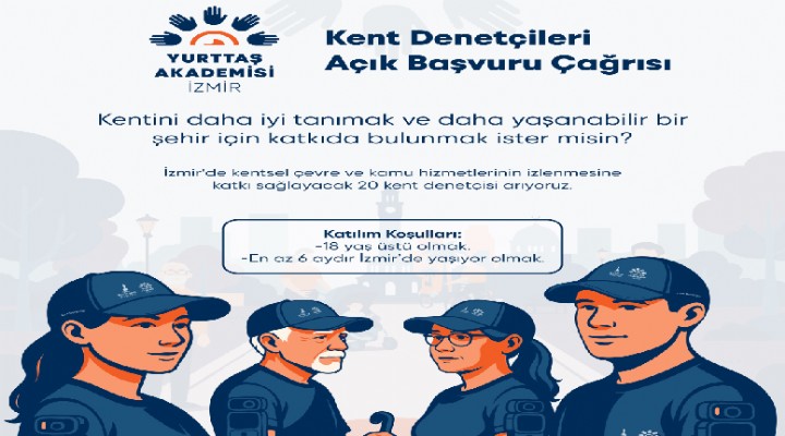 “Sen de İzmir’in geleceği için kent denetçisi olmak ister misin?” sloganıyla projeye davet edilen İzmirliler https://www.izmir.bel.tr/tr/YurttasAkademisi adresinden bilgi alarak başvuru yapabilecek. Çalışmaya 18 yaşını dolduran ve en az 6 aydır İzmir’de yaşayanlar başvurabilecek. Başvuru sistemi iki hafta açık kalacak. Seçilen denetçiler sadece 1 ay süreyle program kapsamında yarı zamanlı istihdam edilecek.