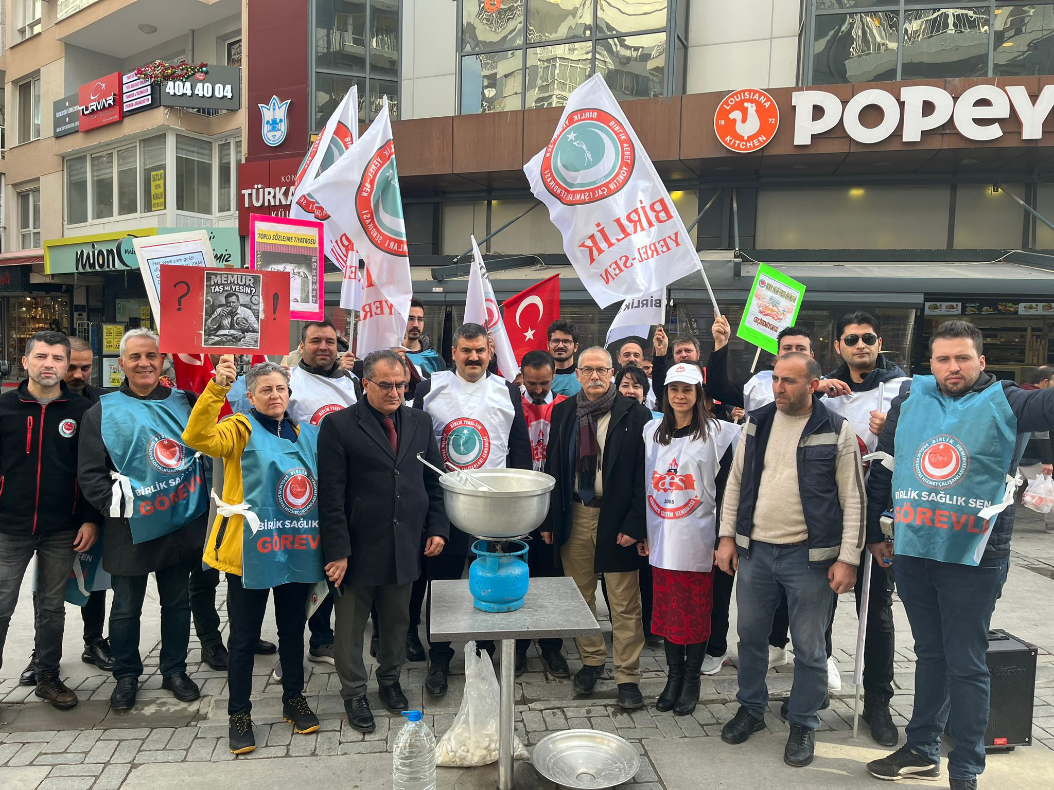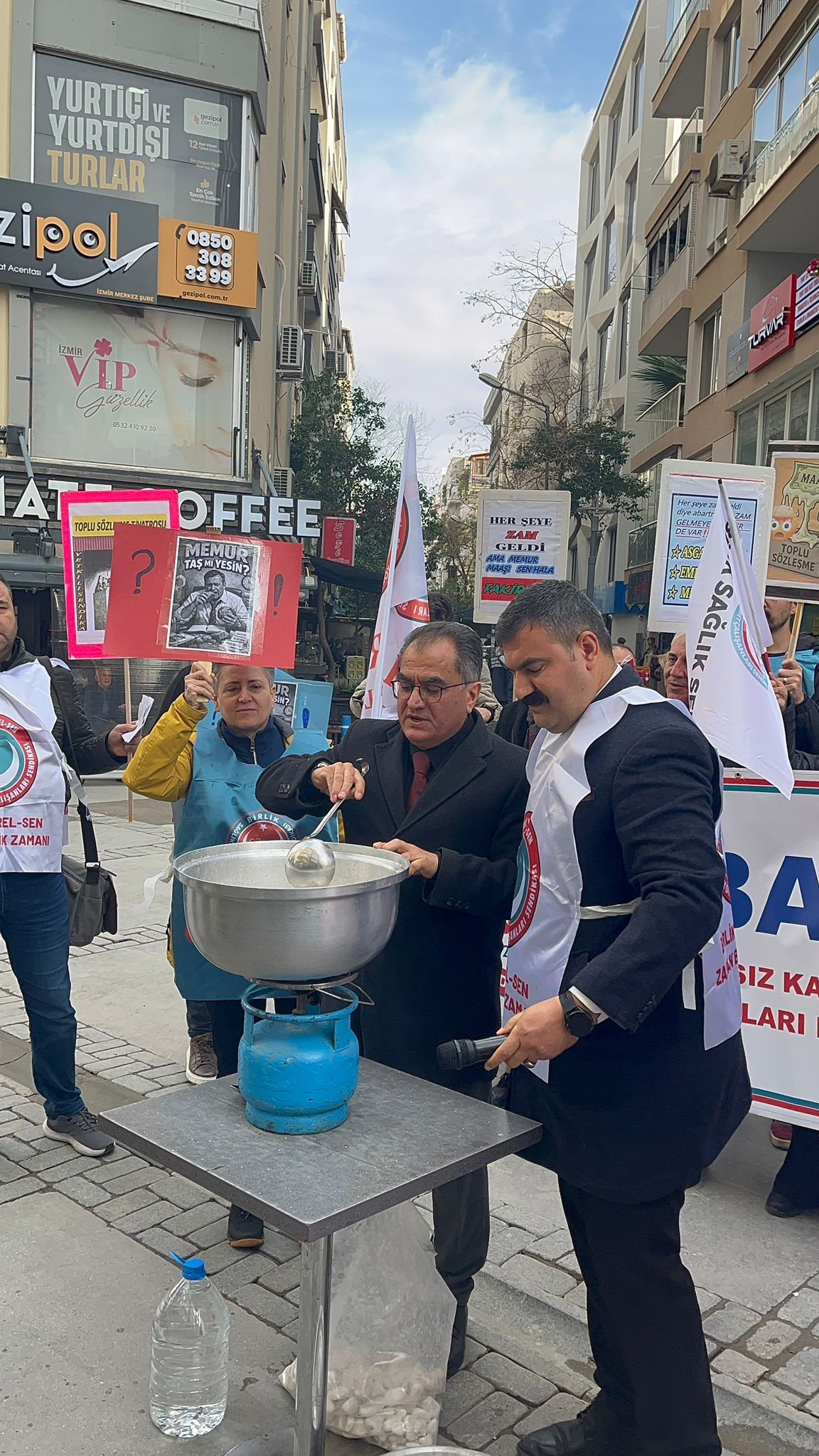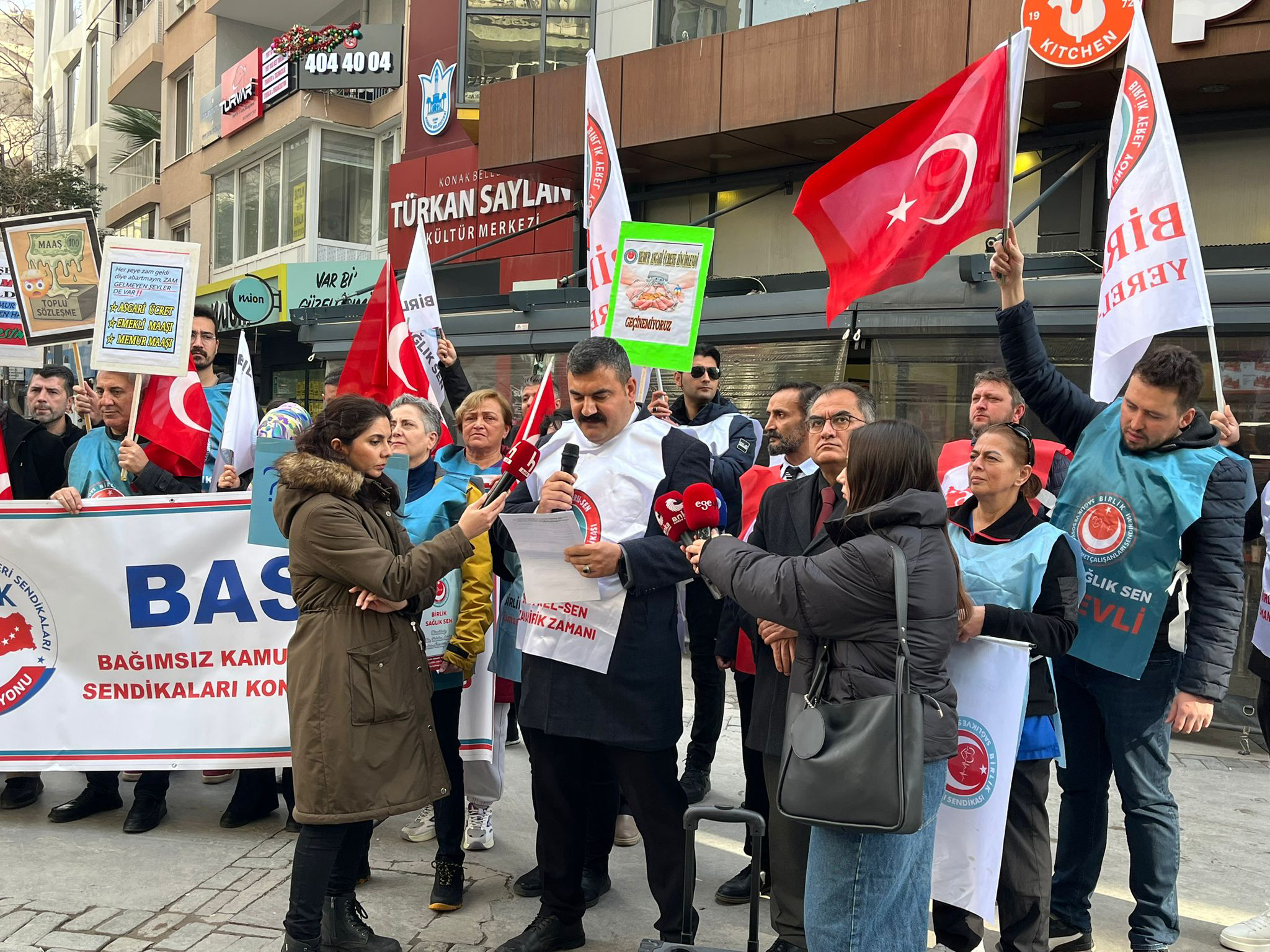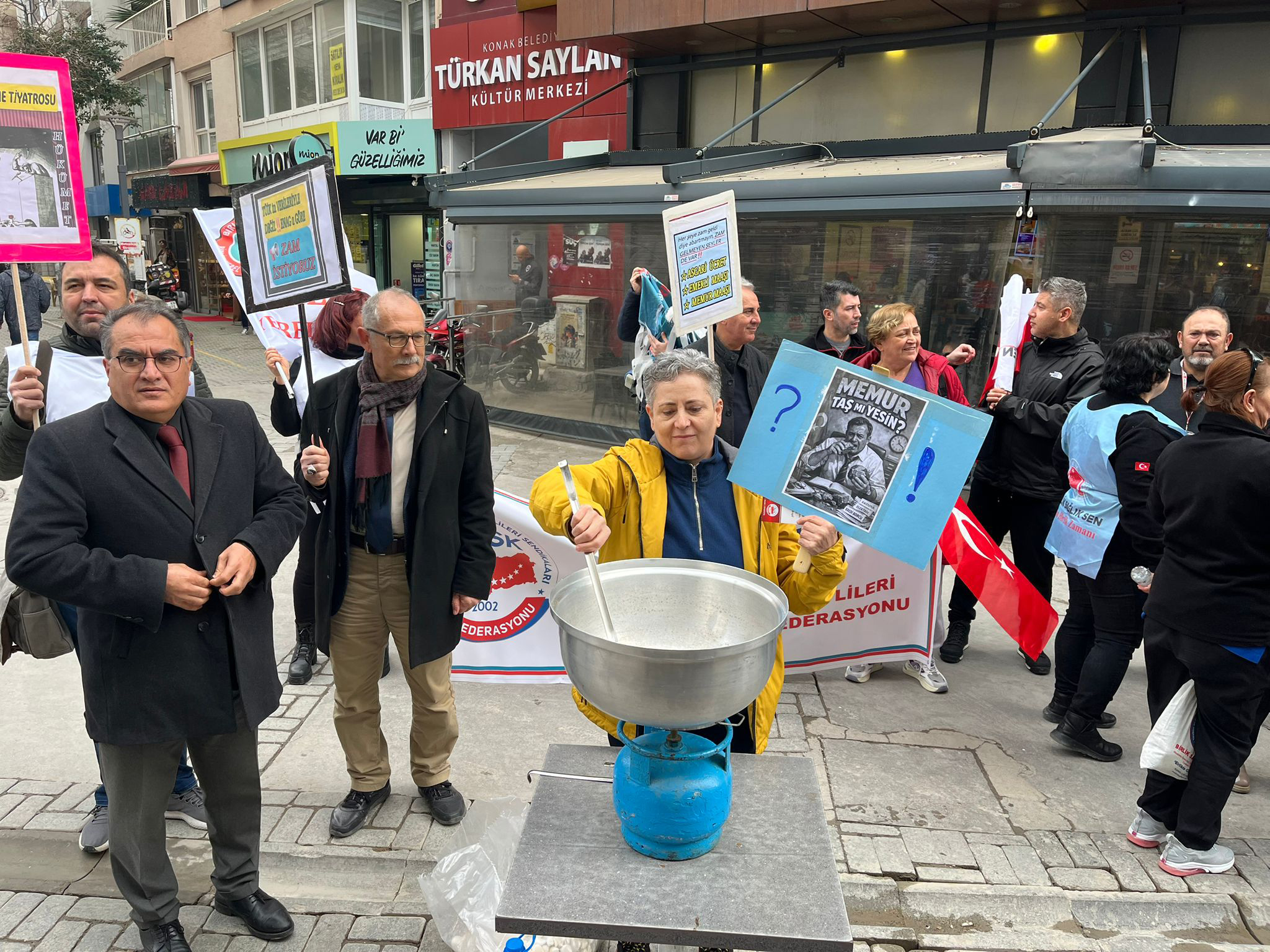 Türkü ERBİL/SONKALEİZMİR- Bağımsız Kamu Görevlileri Sendikaları Konfederasyonu (BASK)’na bağlı sendikalar, 2026 Ocak ayı maaş zamlarını Alsancak Türkan Saylan Kültür Merkezi önünde gerçekleştirdikleri basın açıklaması ile protesto etti. Sendikalar, yüzde 11 ilk toplu sözleşme ve 0,87’lik kasım ayın enflasyonu ile belirlenen yüzde 18,60’lık zam oranlarını tencerede taş kaynatarak eleştirdi.