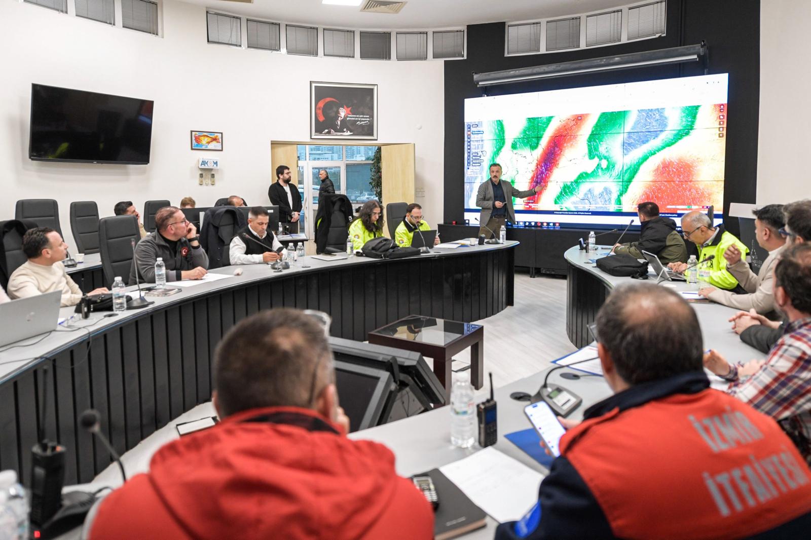 İzmir için verilen turuncu alarm nedeniyle İzmir Büyükşehir Belediyesi tarafından Afet Koordinasyon Merkezi Şube Müdürlüğü’nde (AKOM) kriz masası kuruldu. Sahadan gelen verilerin düzenli toplantılarla değerlendirildiği kriz masasında İzmir Büyükşehir Belediyesi Genel Sekreter Yardımcısı Dr. Hakan Uzun, İZSU Genel Müdür Yardımcısı Onur Demirci, İzmir Büyükşehir Belediyesi Afet İşleri Dairesi Başkanı Eylem Ulutaş Ayatar, İzmir Büyükşehir Belediyesi İtfaiye Dairesi Başkanı Yaşar Korkmaz ve birimlerin yöneticileri ile temsilcileri yer aldı. Kriz masasında kentin dört bir yanından gelen ihbarlar ve bilgilerle sahadaki ekipler yönlendirildi, her türlü kötü senaryo karşısında önlemler alındı.