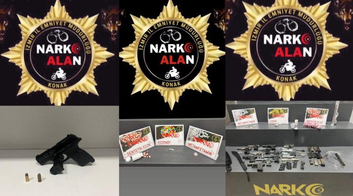 İzmir İl Emniyet Müdürlüğü’ne bağlı Narkotik Suçlarla Mücadele Şube Müdürlüğü ve Konak İlçe Emniyet Müdürlüğü ekiplerince oluşturulan Narkoalan timleri, 1-14 Ekim 2025 tarihleri arasında 11 farklı işyeri ve ev adreslerine operasyon düzenledi. Uyuşturucu ve silah ticaretine yönelik yapılan çalışmada, 103 gram bonzai, 14 gram kokain, 14 gram metamfetamin, 849 adet sentetik hap, 17,91 gram esrar, 3 hassas terazi, 15 bin 50 TL nakit para, 3 tabanca, 2 pompalı tüfek, 44 fişek ile çok sayıda silah parçası ele geçirildi.