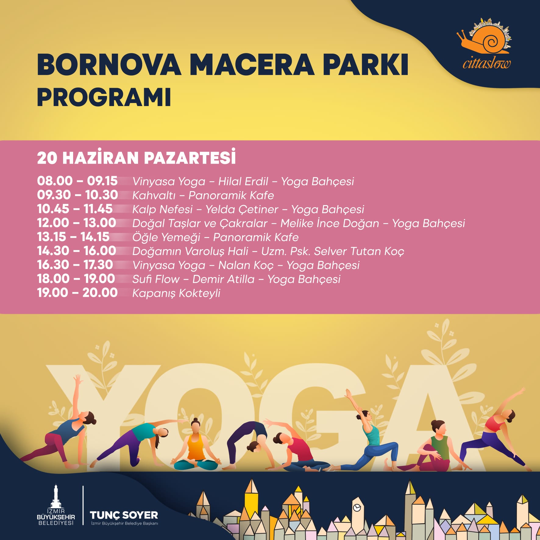Macera Parkı’nda “Matını ve çadırı al gel” sloganıyla düzenlenecek yoga kampı kapsamında 17 Haziran Cuma günü Aslı Başar ile yoga terapi, Gülin Zeytinlu ile yoga akışı, Onur İstek ile zeybek yoğa, Burcu Güçlü ile gitar meditasyonu, 18 Haziran Cumartesi günü Begüm Berberoğlu ile sunrise yoga, Saadet Çıngır ile Sivanando yoga, Yelda Çetiner ile holistik nefes ve mindfulness, Uzm. Psk. Selver Tunca Tutan Koç ile yaşam ağacım, Yeşim Atik ile Yin Yoga, Gülen Şerbetman ile gong eşliğinde sound heading, Begün Berberoğlu ile masal terapisi yapılacak.
