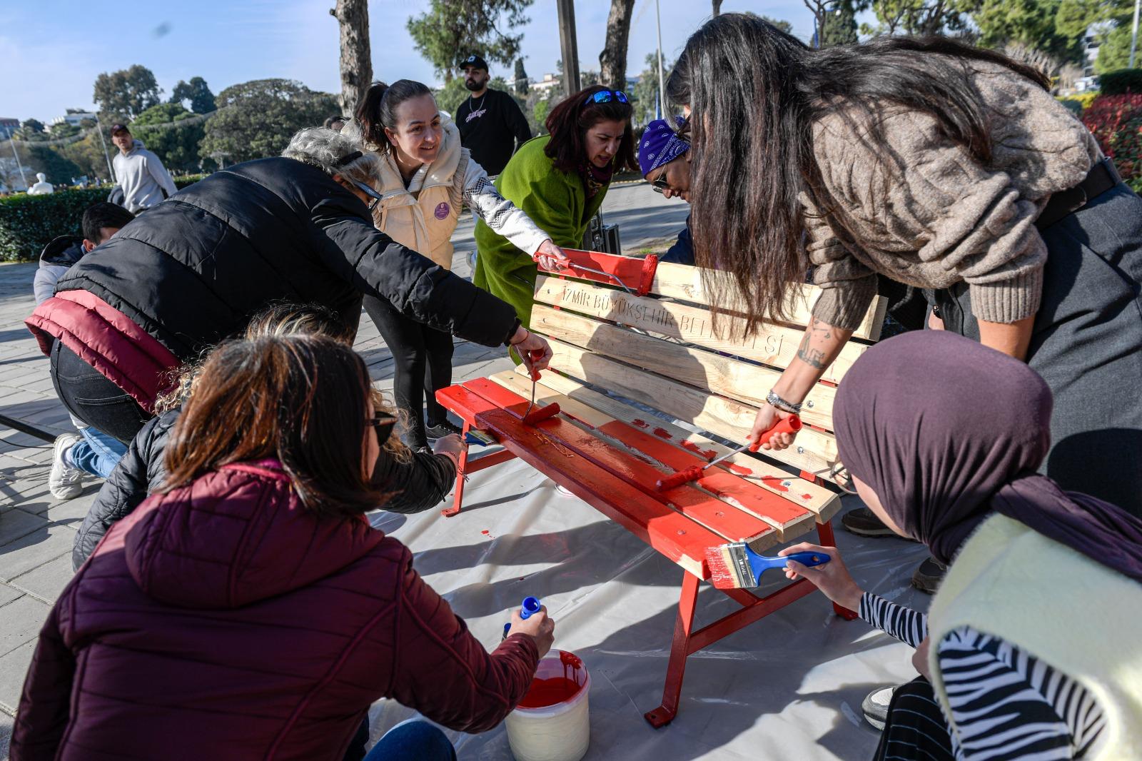 Konuşmaların ardından Başkan Tugay, eşi Öznur Tugay ve Daniele Bianchi bankı kırmızıya boyadı. Etkinlikte İzmirli kadınlar da farkındalık çalışmasına katılarak kadına yönelik şiddete karşı mesaj verdi. Başkan Tugay ve eşi Öznur Tugay, programın sonunda kadınlarla sohbet ederek hatıra fotoğrafı çektirdi. Alana yerleştirilen iki kırmızı bankın yanında ayrıca bir QR kod bulunuyor. Koda tıklandığında, “Kırmızı bank, cinayete kurban giden bir kadının toplumda bıraktığı boşluğun sembolüdür. Kadınlara yönelik şiddete hayır. İzmir İtalya Konsolosluğu ve İzmir Büyükşehir Belediyesi iş birliğiyle, 8 Mart Dünya Kadınlar Günü anısına kadınlar tarafından boyanmıştır” mesajı yer alıyor.