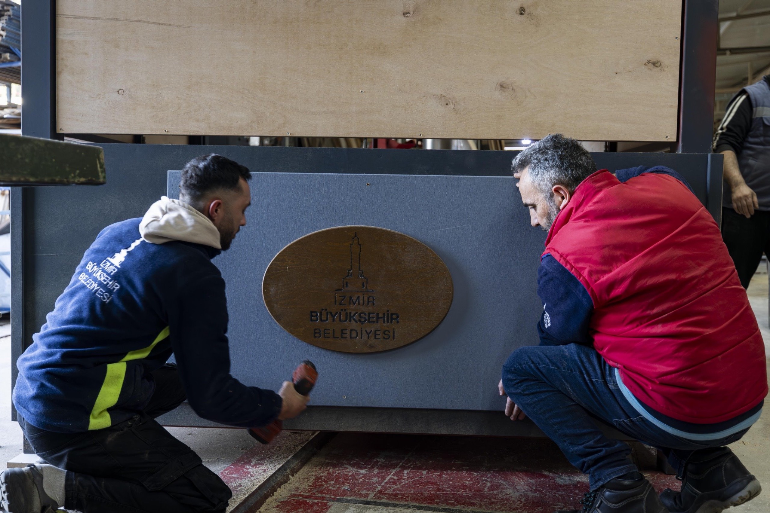 İzmir Büyükşehir Belediyesi, kentin sosyal donatı alanlarında kullanılan ekipmanları kendi bünyesinde üreterek yenilemeye devam ediyor. Park ve Bahçeler Dairesi Başkanlığı Ağaçlandırma Şube Müdürlüğü bünyesindeki Buca’daki Fırat Atölyesi, profesyonel ekibiyle kent genelinde kullanılan çöp potalarından banklara, piknik masalarından kent mobilyalarına, uyarı levhalarından sokak hayvanları için beslenme ve barınma odaklarına, satış dükkânlarından yeni yıl fotoğraf alanlarına kadar çok sayıda şehir donatısını bünyesinde üretiyor. 2025 yılında 2 binin üzerinde bank, bin 600 adet çöp potası ve 600 piknik masası üretilerek İzmirlinin hizmetine sunulmak üzere montajları yapıldı. İzmir Büyükşehir Belediyesi, kendi bünyesinde yürüttüğü bu uygulamayla hem yaşamı kolaylaştıracak estetik yeni tasarımları kente kazandırıyor hem de önemli ölçüde tasarruf sağlıyor.