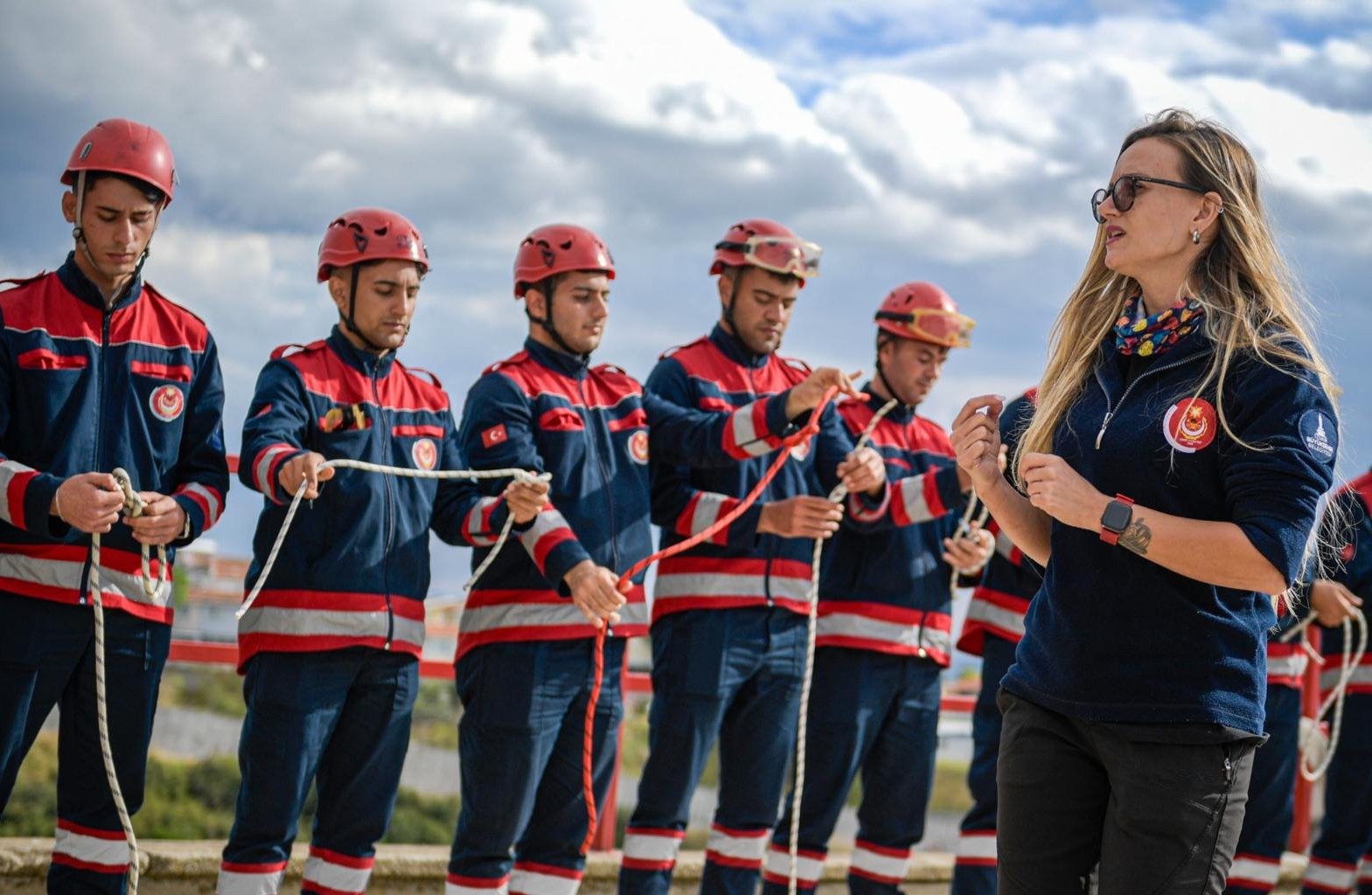 Eğitim Çavuşu Mesut Topal ise 15 metre yükseklikteki kuleden iple erişim tekniklerini anlattı. Topal, “Mesleğe yeni başlayan itfaiyeci arkadaşlarımıza basit istasyon kurulumu, yük dağılımı istasyon kurulumu, kullandığımız iplerin özellikleri hakkında eğitim veriyoruz. Teorik eğitimlerin ardından uygulamaya geçiyoruz. 15 metrelik kuleden aşağıya seri şekilde iniş ve tekrar yukarı tırmanma pratiği yapıyoruz. İpte asılı kalmış kişileri kurtarma, vadide, uçurumda, kuyularda kurtarılmayı bekleyen insanları, hayvanları kurtarma tekniklerini öğretiyoruz. Kentsel arama kurtarma, trafik kazalarında kurtarma ve iple erişim eğitimlerinin ardından arkadaşlarımız yeterli donanıma sahip oluyorlar. Biz de doğru ve eksiksiz bilgi vermek için elimizden geleni yapıyoruz. Bu sürecin sonunda umuyoruz ki arkadaşlarımız olaylara müdahale edecek yeterliliğe sahip olacak” diye konuştu.