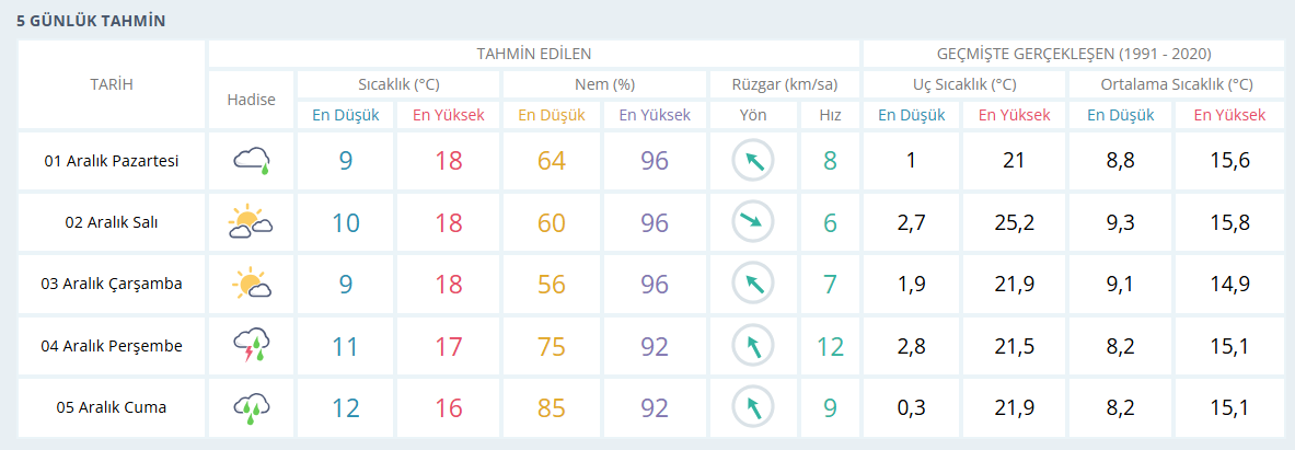Pazartesi günü kent geneline bulutlu bir hava hakim olurken, en düşük sıcaklık 9 dereceye kadar inecek, gün içinde en yüksek sıcaklık 18 derece seviyesinde olacak. Salı günü parçalı bulutlu bir hava öngörülürken sıcaklık bir önceki günle benzer olarak 10 derece ile 18 derece arasında değişecek. Çarşamba günü güneş yüzünü gösterirken sıcaklık değişmeyecek. Perşembe günü ise yağış etkisini gösterirken en düşük sıcaklık 11 en yüksek sıcaklık ise 17 derece olacak. Cuma günü ise yağış devam ederken sıcaklık 12 ve 16 derece arasında seyderecek.