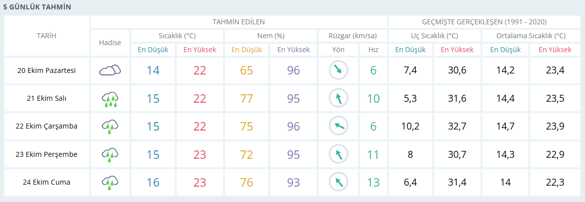 Pazartesi 22 derece olan hava sıcaklığı akşam saatlerinde 14 dereceye kadar düşecek. Pazartesi günü kentte bulutlu bir hava hakim olurken Salı ve Çarşamba günü İzmirlileri yağmur karşılayacak. Hava sıcaklığı 22 derece seyrini korurken en düşük 15 derece olacak. Perşembe günü 23 derecelik sıcaklıkla yer yer sağanak yağış devam ederken sıcaklık 15 dereceye kadar düşecek. Cuma günü 23 derecelik sıcaklık korunurken İzmirliler hafta içini sağanak yağış ile kapatacak, en düşük sıcaklık ise 16 derece olacak.