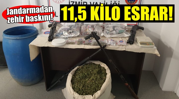 İzmir İl Jandarma Komutanlığı'na bağlı ekipler yürütülen soruşturma kapsamında Menderes ilçesindeki bir adrese operasyon düzenledi. Adreste bulunan 2 kişi gözaltına alınırken yapılan aramalarda 10,5 kilogram kubar esrar, 7 gram kenevir tohumu, 2 adet hassas terazi, 1 adet kuru sıkı tabancave 4 adet ruhsatsız av tüfeği ele geçirildi.