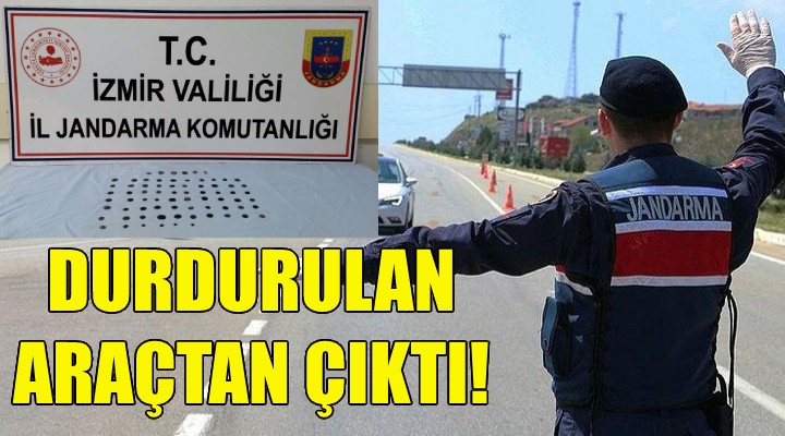 Kontroller sırasında içerisinde 2 kişinin bulunduğu araçta yapılan aramada 65 adet Osmanlı, Roma ve Bizans dönemine ait sikke ile 7 adet tarihi eser niteliğinde obje ele geçirildi.