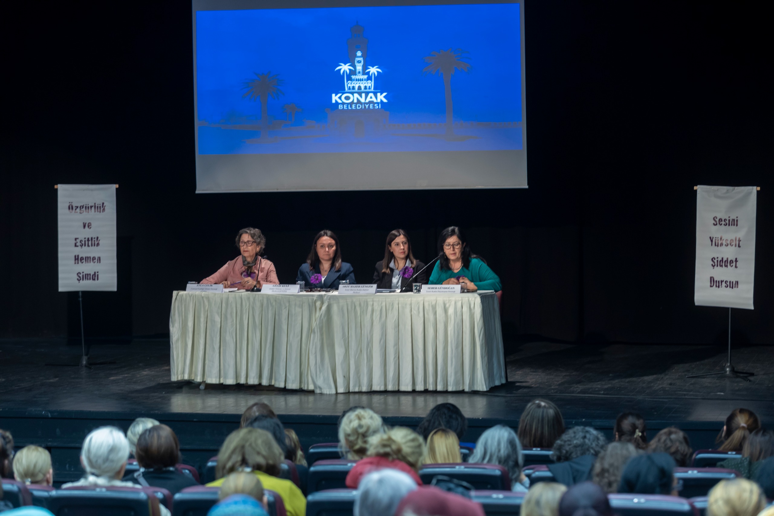 Panelin açılış konuşmasını gerçekleştiren Başkan Nilüfer Çınarlı Mutlu, sadece bu yılın başından itibaren 411 kadının öldürülerek hayattan koparıldığına vurgu yaptı. Bunun bir cinskırımı olduğuna dikkat çeken Başkan Mutlu, bu vahşete sessiz kalmamak amacıyla bir araya geldiklerini dile getirdi. Kadına yönelik şiddetle mücadelede hep birlikte olup mücadeleyi büyütmek gerektiğine değinen Başkan Mutlu, bu amaçla Kadın Danışma ve Dayanışma Merkezlerini hayata geçirdiklerini söyledi ve konuşmasını şöyle sürdürdü: “Kadınların sesini büyütmek, gücünü artırmak zorundayız. Kadınların, şiddet karşısında çalabileceği bir kapıları olsun istedik ve Kadın Danışma ve Dayanışma Merkezlerimizi hayata geçirdik. Psikolojik ve hukuki destek birimlerimiz var. Burada, şiddete uğrayan kadınlar için oluşturduğumuz başvuru ve yönlendirme mekanizmalarımız var. Toplumsal cinsiyet eşitliği eğitimlerimiz ve mahalle düzeyinde yürüttüğümüz bilgilendirme çalışmalarımız var. Farklı mahallelerimizde hizmet veren Mutlu Çocuklar Oyun Evlerimiz ile kadınların üzerindeki yükü bir nebze de olsa almaya çalışıyoruz. Hayata geçirdiğimiz meslek edindirme kurslarıyla kadınlara ekonomik özgürlük alanı açıyoruz. Kadın emeğini, düzenlediğimiz kermeslerle görünür kılıyor, bu değerin karşılık bulmasını sağlıyoruz. Konak’ta hiçbir kadının kendini yalnız hissetmediği, hiçbir çocuğun şiddetin gölgesinde büyümediği, eşitlikten ve adaletten yana bir kent inşa etmek için çalışıyoruz.”“Konak Belediyesi olarak sorumluluğun farkındayız”