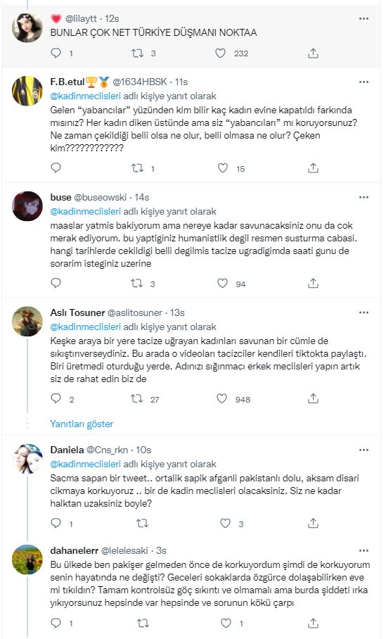 Türk kadınlarına yönelik sığınmacı tacizine tek söz etmeyen, tersine buna tepki gösterenleri ırkçılıkla suçlayan Kadın Meclisleri'nin açıklamasına tepki yağdı.