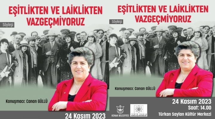 Kadına Yönelik Şiddete Karşı Uluslararası Mücadele Günü etkinlikleri kapsamında, Türkiye Kadın Dernekleri Federasyonu Başkanı Canan Güllü, “Eşitlikten ve Laiklikten Vazgeçmiyoruz” başlığı altında bir söyleşi gerçekleştirecek. 24 Kasım tarihinde yapılacak söyleşi Türkan Saylan Kültür Merkezinde saat 14.00’te başlayacak. Söyleşi öncesi ise Türkan Saylan Kültür Merkezi önünde, Konak Belediye Başkanı Abdül Batur ve 109 kadın sivil toplum kuruluşu temsilcisinin katılacağı bir basın açıklaması gerçekleştirilecek.