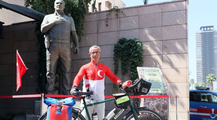 Orhan Kotluk, bisiklet yolculuğu öncesinde, İzmir Cumhuriyet Başsavcısı Fahri Mutlu Tosun ve Adli Yargı Adalet Komisyonu Başkanı Oktay Tabur ile kahraman polis memuru Fethi Sekin'in İzmir Adliyesindeki heykeli önünde bir araya geldi.