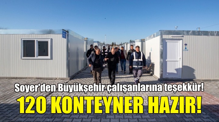 16 dönüm arazi üzerinde 232 konteyner için altyapı çalışmalarının tamamlandığını söyleyen İzmir Büyükşehir Belediye Başkanı Tunç Soyer, “120 tanesinin de montajı bitti. Tamamen iç tefrişi de tamamlandı. Pis su, temiz su altyapısı, şofben, mutfak, yataklar ve dolaplarıyla 120 konteynerimiz hizmet verecek. Geriye kalan 112 konteyner için de arkadaşlarımız hazırlıkları tamamladı. Her birine minnettarım. Her birine çok teşekkür ediyorum. Burada çalışmak İzmir'de çalışmaya benzemiyor. Koşullar çok daha ağır. Bütün bunları aşarak büyük bir vicdanla, yüce gönüllülükle bu işi yaptılar” dedi.