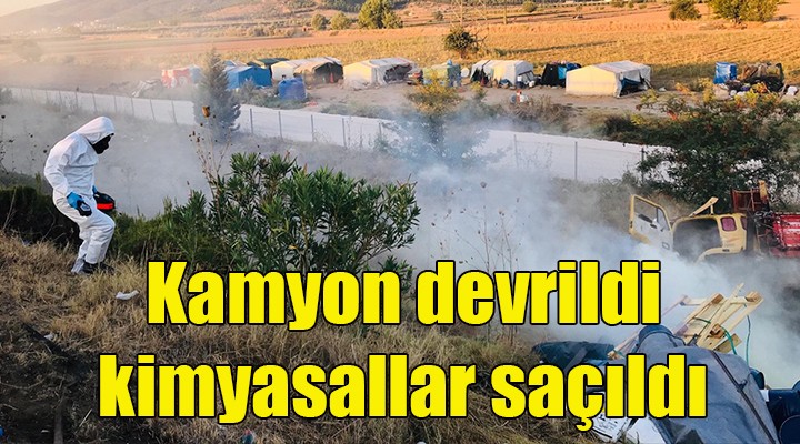 Şarampole devrilen kamyonun kasasındaki varillerde bulunan çeşitli cinslerdeki kimyasal maddeler, duman ve koku yayarak yol kenarına döküldü.