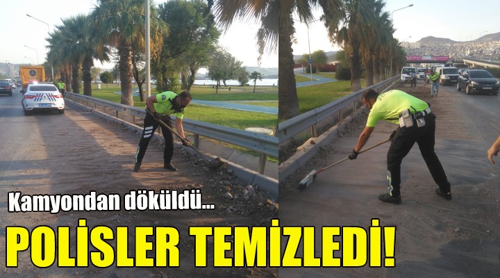 Şeridin kapanması ve molozların trafik güvenliğini tehlikeye sokması üzerine bölgede görev yapan 4 trafik polisi harekete geçti.