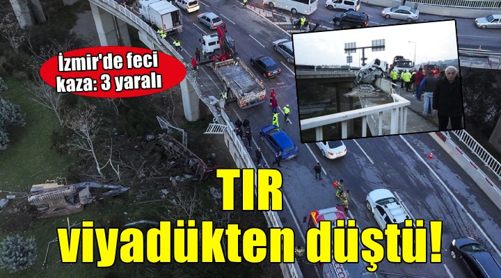İzmir'in Buca ilçesinde, iş makinesi yüklü tırın hafif ticari araca çarptıktan sonra viyadükten düşmesi sonucu 3 kişi yaralandı.