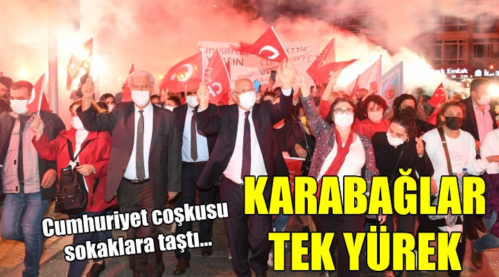 Akşam saatlerinde de Karabağlar Belediyesi'nin geleneksel Cumhuriyet Korteji yürüyüşü gerçekleştirildi. Fahrettin Altay Metro İstasyonu'nda buluşan vatandaşlar, saat 19.00'dan itibaren Uğur Mumcu Parkı'na doğru yürüyüşe geçti. Bandonun çaldığı marşlar eşliğinde, coşkuyla gerçekleştirilen yürüyüş boyunca, 100 metrelik Türk bayrağı ve Atatürk posteri taşındı. Evlerinin balkonlarına, pencerelerine çıkan vatandaşların yanı sıra araçlarında bulunan sürücüler, korteji sevinç gösterileriyle selamladılar. Göztepe Spor Kulübü taraftarları da Göztepe Stadyumu önünde yaktıkları meşalelerle korteji karşıladılar.