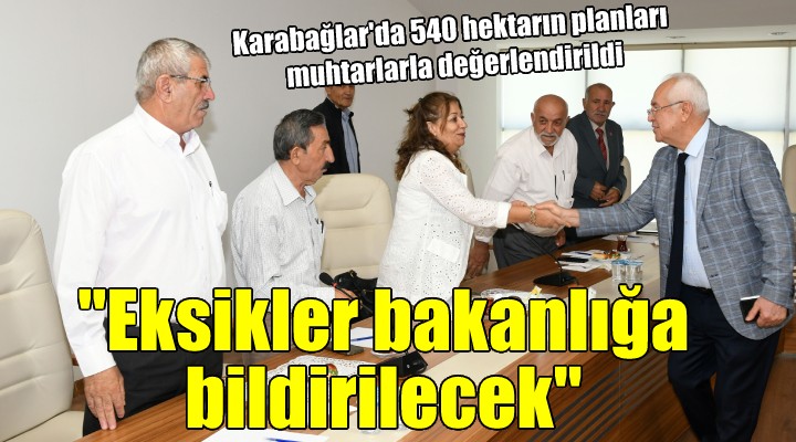 Karabağlar Belediyesi Etüd Proje Müdürü Hande Ertenoğlu'nun sunumunun ardından muhtarlara seslenen Başkan Selvitopu, bakanlığın onayladığı 1/5000 ölçekli imar planlarının 7 Ekim'e kadar Çevre Şehircilik ve İklim Değişikliği Bakanlığı İzmir İl Müdürlüğü'nde askıda kalacağını hatırlattı. Belediyenin teknik ekiplerinin bu planla ilgili bir ön inceleme yaptığını belirten Başkan Selvitopu, ulaşım aksları, pazaryerleri, parklar, belediye hizmet ve gelişme alanları gibi konularda tespit ettikleri teknik eksiklikleri, bakanlığa bildireceklerini söyledi.