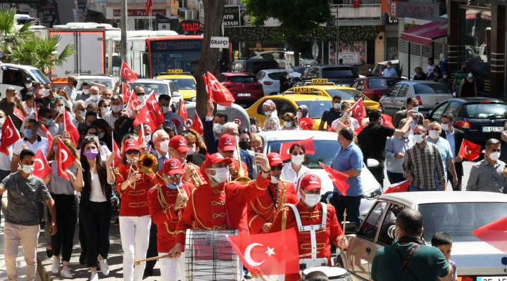 Karabağlar Belediyesi tarafından oluşturulan ve kırmızı beyaz balonlarla, Atatürk posterleriyle süslenmiş araç konvoyu, ilçe sokaklarını turladı. Araçlardan sürekli marşlar çalınırken, vatandaşlar alkışlarla ve el sallayarak konvoyu selamladı.