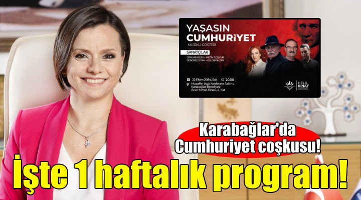 Karabağlar Belediye Başkanı Helil Kınay, Ulu Önder Mustafa Kemal Atatürk ve silah arkadaşlarının zaferler kazanarak kurduğu Cumhuriyetin 101. gurur yılını kutladıklarını belirterek “Karabağlar Belediyesi olarak düzenleyeceğimiz etkinliklere tüm vatandaşlarımızı davet ediyoruz. Cumhuriyetimize yakışır güzellikte daha nice bayramları hep birlikte yaşamak dileğiyle” diye konuştu.
