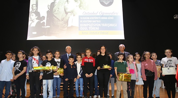 Program kapsamında, Karabağlar Belediyesi tarafından düzenlenen ve ilçedeki ortaokul öğrencilerinin katıldığı “Atatürk’e Mektup” konulu kompozisyon yarışmasının ödül töreni yapıldı. Eserkent Ortaokulu’ndan Can Mert Erçeşmeli’nin birinci, Zeyni Hanım Ortaokulu’ndan İrem Bedeloğlu’nun ikinci, Fevzi Çakmak Ortaokulu’ndan Fatma Sevim Savan’ın üçüncü olduğu yarışmada, Seçici Kurul Özel Ödülü’ne de Seniha Mayda Ortaokulu’ndan Ammar El Meşhud değer görüldü. Derecelere göre bilgisayar, tablet, fotoğraf makinesi ve kitap seti olarak sıralanan ödülleri öğrencilere, Başkan Selvitopu verdi. Daha sonra yarışmaya katılan tüm öğrenciler, Selvitopu ve seçici kurul üyeleriyle birlikte anı fotoğrafı çektirdi. Yarışmanın seçici kurulu da Yunus Bekir Yurdakul (editör), Birsen Ferahlı (yazar), Hakkı Karadeniz (eğitimci), Ali Batur İbiş (Türkçe Öğretmeni) ve Ayla Sert’ten (Karabağlar Belediyesi Kültür ve Sosyal İşler Müdürü) oluştu.