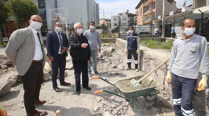Yunus Emre Mahallesi’ndeki Biruni Anadolu İmam Hatip Ortaokulu ve Lisesi bahçesindeki taş duvar yapım çalışmalarını da denetleyen Başkan Selvitopu, işçilere kolaylıklar diledi.