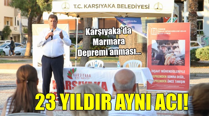 Karşıyaka Belediyesi, TMMOB İnşaat Mühendisleri Odası İzmir Şubesi ve Karşıyaka Kent Konseyi tarafından Bostanlı Zühtü Işıl Meydanı’nda 17 Ağustos 1999'da meydana gelen depremi anma etkinliği düzenlendi. Etkinliğe; Karşıyaka Belediye Başkanı Dr. Cemil Tugay ve eşi Öznur Tugay, Karşıyaka Kentsel Dönüşüm Müdürü Aynur Gündoğdu ve Karşıyaka Kent Konseyi üyeleri de katıldı. Etkinlik; Depreme Duyarlılık ve İzmir Depremi Fotoğrafları Sergileri çalışması ile başladı. 17 Ağustos Depremi’nin yıkıcılığının anlatıldığı sergi, halk tarafından dikkat çekti. Şantiye Tozu Tiyatrosu tarafından “Zar Atma” oyunu sergilendi. Oyunda ev alırken yapılan bir hata seyircilere soruldu. Seyircilerden doğru cevabı veren kişiye kuş evi hediye edildi. Egeyi Sevenler Derneği tarafından dans gösterisi yapıldı. Gösteri de bir müteahhidin çektiği vicdan azabı konu alındı. Dans gösterisi sonrası duygu dolu anlar yaşandı. Etkinliğin sonunda Afet Yönetiminde Vatandaşın Rolü ve Sorumluluğu ve Afet Yönetimi üzerine forum gerçekleştirildi. Forumun moderatörü Karşıyaka Kent Konseyi Başkanı Selman Boyacıoğlu olurken, konuşmacı olarak Emekli Vali Yardımcısı Mustafa Aydın ve İMO İzmir Şubesi’nden Nurgül Atabay yer aldı.