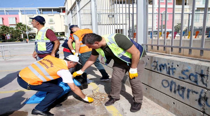 Büyükşehir Belediyesi’nden 16 kişilik ekip; 4 adet vakumlu yol süpürme aracı, 1 adet van tipi afiş sökme yol yıkama aracı ve 18 tonluk su tankeri ile çalışmalara katıldı. Karşıyaka Belediyesi de 16 kişilik ekip; 2 vakumlu yol süpürme aracı, 1 adet van tipi afiş sökme yol yıkama aracı, 1 adet 15 tonluk su tankeri ve 3 adet elle kumandalı elektrikli vakumlu yol süpürme aracı ile seferberlikte görev aldı. İzmir Büyükşehir Belediyesi’nin öncülüğünde, hem kenti temizlemek hem de farkındalık yaratmak amacıyla başlatılan kampanya, her hafta Karşıyaka’nın başka bir mahallesinde devam edecek.