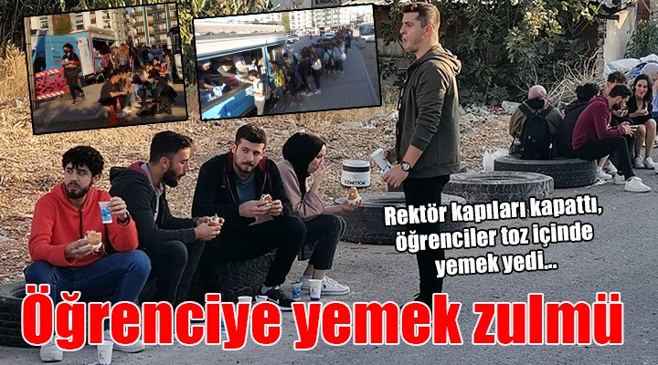 SONKALEİZMİR-İzmir Büyükşehir Belediyesi'nin, üniversite öğrencilerine hafta içi günleri kampüste ücretsiz yemek dağıtma hizmetine Katip Çelebi Üniversitesi yönetiminden izin çıkmadı. Kampüs içerisine girmeleri engellenen İzmir Büyükşehir Belediyesi Sosyal Hizmetler Dairesi Başkanlığı personeli de çareyi üniversite kapısı önünde yemek dağıtmakta buldu. Yüzlerce metre kuyruk oluşturan öğrenciler, aldıkları yemeklerini kaldırımda toz içinde, bir araba üzerinde ya da etrafta buldukları bir araba lastiği üzerine oturup yedi.
