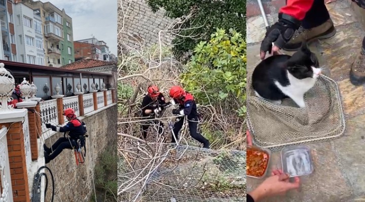 İzmir Büyükşehir Belediyesi İtfaiye Dairesi Başkanlığı ekipleri, Konak Turgut Reis Mahallesi’ndeki Tarihi Asansör binasının kayalık kısmında mahsur kalan kedinin yardımına yetişti. Yaklaşık 25 metre yüksekliğindeki kayalıklara çekili tel örgülerin arasına sıkışan kediyi kurtarmak için yüksek açı ip sistemi kuruldu. Dağda arama kurtarma ekipleri, kayalıklardan aşağı inerek, kediyi kurtarma filesi içine aldı. Tarihi Asansör tesislerinde çalışanlar tarafından bakılan kedi bulunduğu yerden kurtarılarak yaşadığı alana bırakıldı. Kurtarma operasyonuna tanık olan yurttaşlar da ekiplere alkışlarla destek verdi.