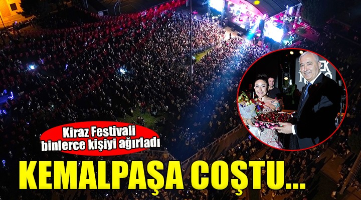 Kemalpaşa Rekreasyon Alanı'nda gerçekleşen festival etkinliği binlerce Kemalpaşalı’nın katılımıyla tamamlandı. Sunuculuğunu İlkay Kıyak'ın üstlendiği geceye Hakan Doğanay sahne şovlarıyla renk kattı. Festivalin en ilgi çeken etkinliklerinden biri olan ‘En İyi kiraz Üreticileri’’ yarışmasında dereceye giren üreticilere ödüller verildi. Ödüllerini Kemalpaşa Belediye Başkanı Mehmet Türkmen’in elinden alan üreticilerden, 1. Olan Yukarıkızılca Mahallesi’nden Tahir Canoğlu’na çapa makinesi hediye edildi. Ardından sahne alan sevilen sanatçı Melek Mosso Kemalpaşalılara unutulmaz anlar yaşattı. Alanı dolduran binlerce Kemalpaşalı Mosso’nun şarkılarına hep bir ağızdan eşlik etti. Festivale Kemalpaşa Belediye Başkanı Mehmet Türkmen başta olmak üzere, Kemalpaşa Kaymakamı Musa Sarı, Cumhuriyet Halk Partisi Kemalpaşa İlçe Başkanı Ahmet Yılmaz, Muhtarlar, STK temsilcileri ve binlerce vatandaş katıldı.