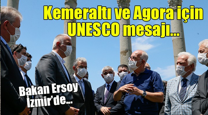 Bakan Ersoy, UNESCO Dünya Mirası Geçici Listesi'ne dahil edilen Kemeraltı ve Agora bölgesinin en kısa zamanda kalıcı listeye girmesi için çalıştıklarını vurgulayarak, şöyle konuştu: "Kemeraltı ve Agora Bölgesi, UNESCO Miras Geçici Listesi'nde. İnşallah kalıcı listeye girmesi için de el birliğiyle çalışıyoruz. İzmir Büyükşehir Belediyesi de uğraşıyor, çabalarından dolayı onlara da teşekkür ediyoruz. Uzun yıllardır Kemeraltı'nın istenilen, özlenilen seviyeye gelmesi için kurulmuş olan gönüllülük esaslı Tarihi Kemeraltı İnşaat Yatırım Ticaret AŞ (TARKEM) var. Onu UNESCO Dünya Miras Listesi'nde Bakanlığın temsilcisi olarak da atadık. İnşallah hızlı bir şekilde eksikliklerini ve dosyasını tamamlayıp, yakın bir gelecekte Kemeraltı ve Agora'nın UNESCO Kalıcı Miras Listesi'ne girmesini el birliğiyle birlikte başaracağız. Ben İzmir Ticaret Odasına da teşekkür ediyorum. Odamız kent ile ilgili projelere tarafsız, objektif yaklaşıp, bize her türlü desteği veriyor. Bu tarz projelere el birliğiyle şeffaf ve iyi niyetli yaklaşılınca çok hızlı sonuç alınabiliyor."