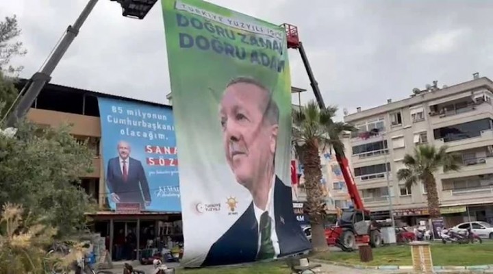 İzmir'in Dikili ilçesinde 4 katlı bir binada, Millet İttifakı Cumhurbaşkanı adayı CHP Genel Başkanı Kemal Kılıçdaroğlu'na ait posterin önüne, 2 vinç yardımıyla Erdoğan'ın posteri asıldı.