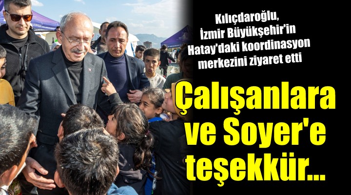 CHP Genel Başkanı Kemal Kılıçdaroğlu, depremin ağır etki yarattığı Hatay’da İzmir Büyükşehir Belediyesi’nin kurduğu Afet Koordinasyon Merkezi’ni ziyaret etti. İzmir Büyükşehir Belediyesi Sosyal Projeler Daire Başkanı Anıl Kaçar ile Sosyal Hizmetler Daire Başkanı Ulaş Aydın, CHP liderine çalışmalarla ilgili bilgi verdi. Bütün belediye başkanlarının canla başla çalıştığını söyleyen Kemal Kılıçdaroğlu, “Belediye başkanlarını başarılı kılan sizlersiniz. Sorunu görüyorsunuz, sorunu çözmek için süratle organize oluyorsunuz. Özellikle çocuklara psikolog eşliğinde yaklaşılması son derece önemli. Onlar için de teşekkür ederim” diye konuştu.