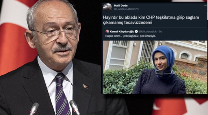"Halil Dede" isimli kullanıcı, Kılıçdaroğlu'nun Başak Cengiz hakkındaki paylaşımını alıntılayarak, "Hayırdır, bu abla da kim? CHP teşkilatına girip sağlam çıkamamış 'tecavüzzede' mi?" yorumu yaptı.