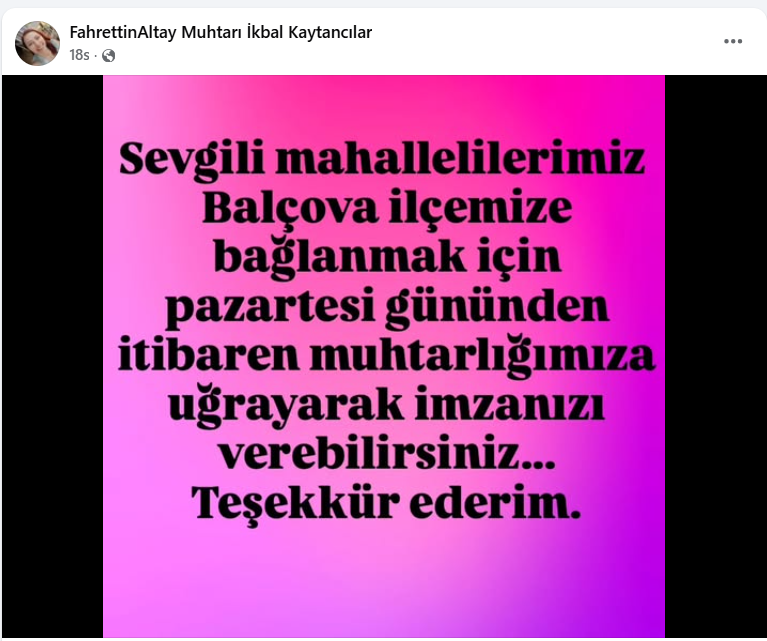 Mahalleliye sosyal medya hesabından duyuru yapan Muhtar Kaytancılar, “Sevgili mahallelilerimiz Balçova ilçemize bağlanmak için pazartesi gününden itibaren muhtarlığımıza uğrayarak imzanızı verebilirsiniz. Teşekkür ederim” paylaşımını yaptı.
