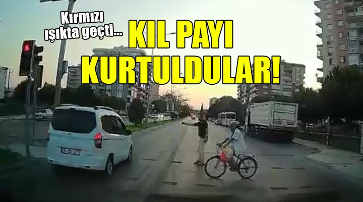 Olay, saat 20.00 sıralarında Bornova Yüzbaşı İbrahim Hakkı Caddesi’nde meydana geldi. İddiaya göre 1'i bisikletli 2 kişi, trafik ışıklarının bulunduğu yerden yolun karşısına geçmek isterken, bu sırada 35 ES 477 plakalı hafif ticari aracın sürücüsü kırmızı ışık ihlali yaptı. O anlar çevredeki bir aracın kamerasına yansırken, kazadan kurtulan 2 kişi, trafik kurallarını hiçe sayan sürücüye tepki gösterdi.