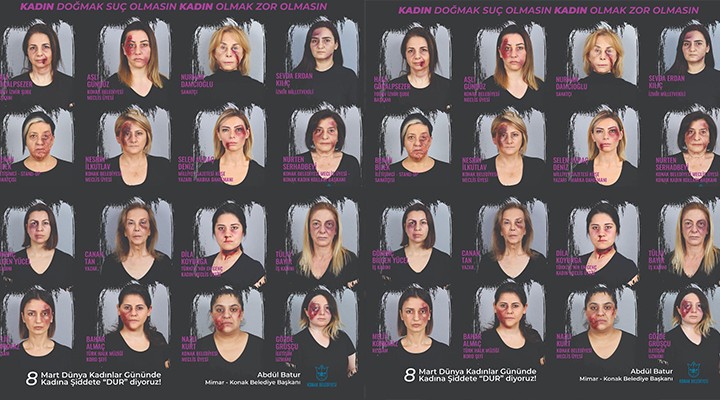Kadına yönelik şiddetin her gün can almaya devam ettiği ülkemizde, şiddetin önlenmesi gerektiğine dikkat çekmek amacıyla Konak’ta İzmirli kadınları kamera önünde bir araya getiren bir proje hazırlandı. Kadınlar Günü için hazırlanan “Kadın Doğmak” adlı projede iş, sanat ve siyaset dünyasından 16 kadın şiddete uğrayan kadınların sesi oldu. Plastik makyaj uygulaması ile kadınların maruz kaldığı şiddetin tüm gerçekliğiyle gözler önüne serildiği projede sırayla kamera karşısına geçerek kadına yönelik şiddete kesin bir dille “hayır” dedi.